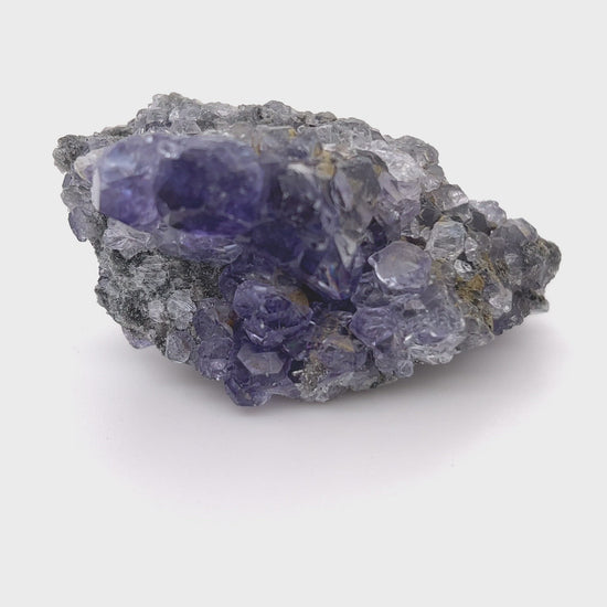 Purple Fluorite Specimen on matrix. The crystal has a beautiful mix of purple to clear crystals and grows in attractive clusters on the black background which gives it excellent contrast and a beautiful aesthetic. A perfect specimen for any collection, or display in any home or space