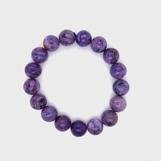 This deep purple bracelet is made with 11mm Charoite beads. This stone represents beauty, balance, and harmony. The stone emits a large number of negative ions which make it a powerful stress reliever and energy healer